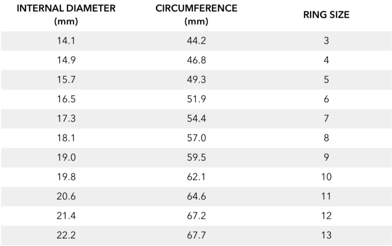If you don’t know your ring size, please mesure as precisely as possible the inside diameter of one of your ring, refer to the first column of the size chart and look at the corresponding Canadian size.